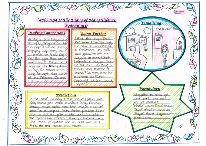 The Senior School students read Who Am I: Diary of Mary Talence as part of their Literature Study. The diary followed the life of Mary Talence, an Aboriginal girl in 1937. Students were required to complete an in-depth novel study where they explored the main literacy concepts of: Making Connections, Predicting, Visualising, Going Further and Vocabulary.